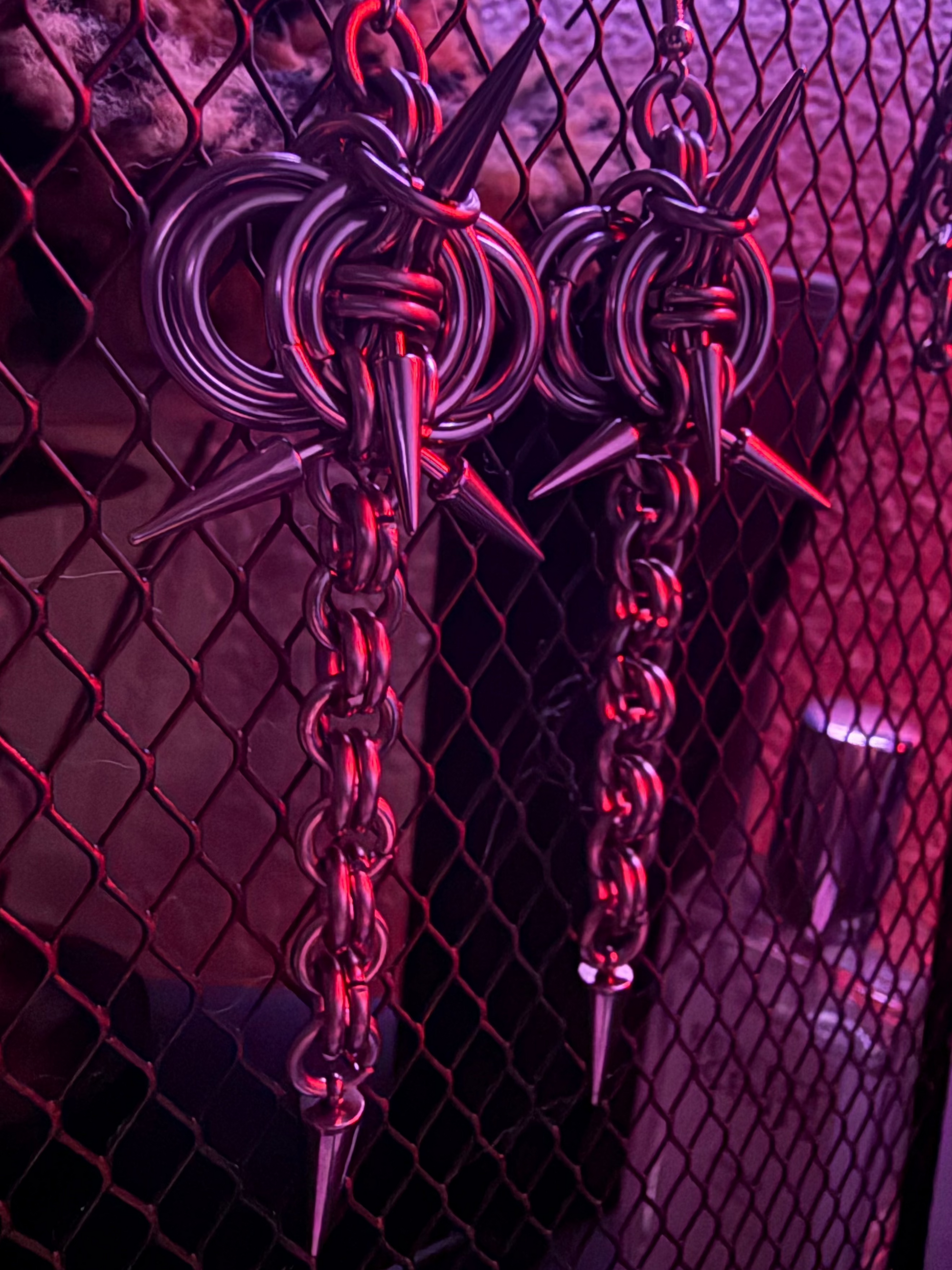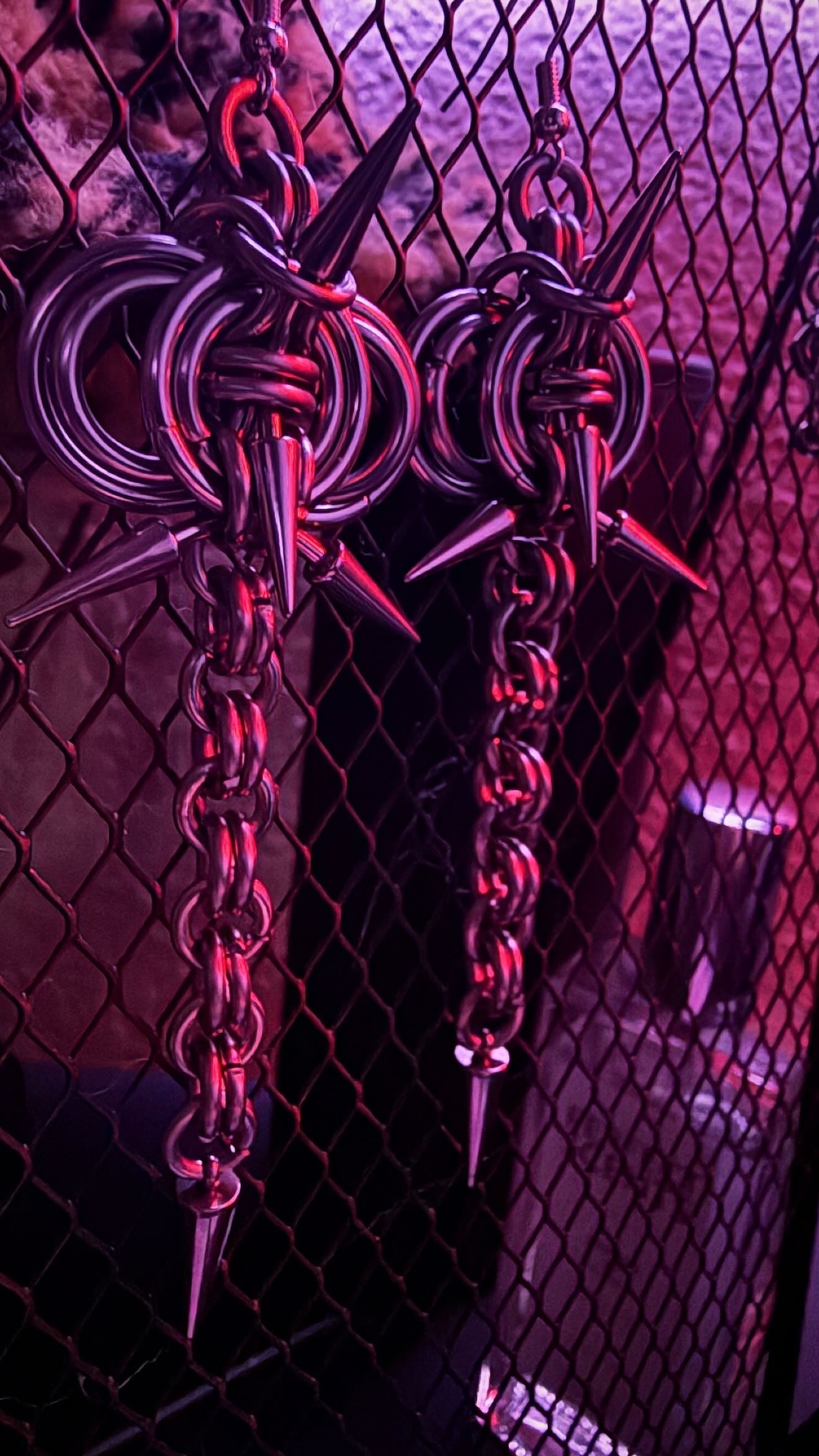 These stunning handmade earrings perfectly complement the Thornkiss choker, adding an elegant and edgy touch to any outfit. Made from high-quality stainless steel, they are both stylish and durable. Elevate your look with these unique earrings.